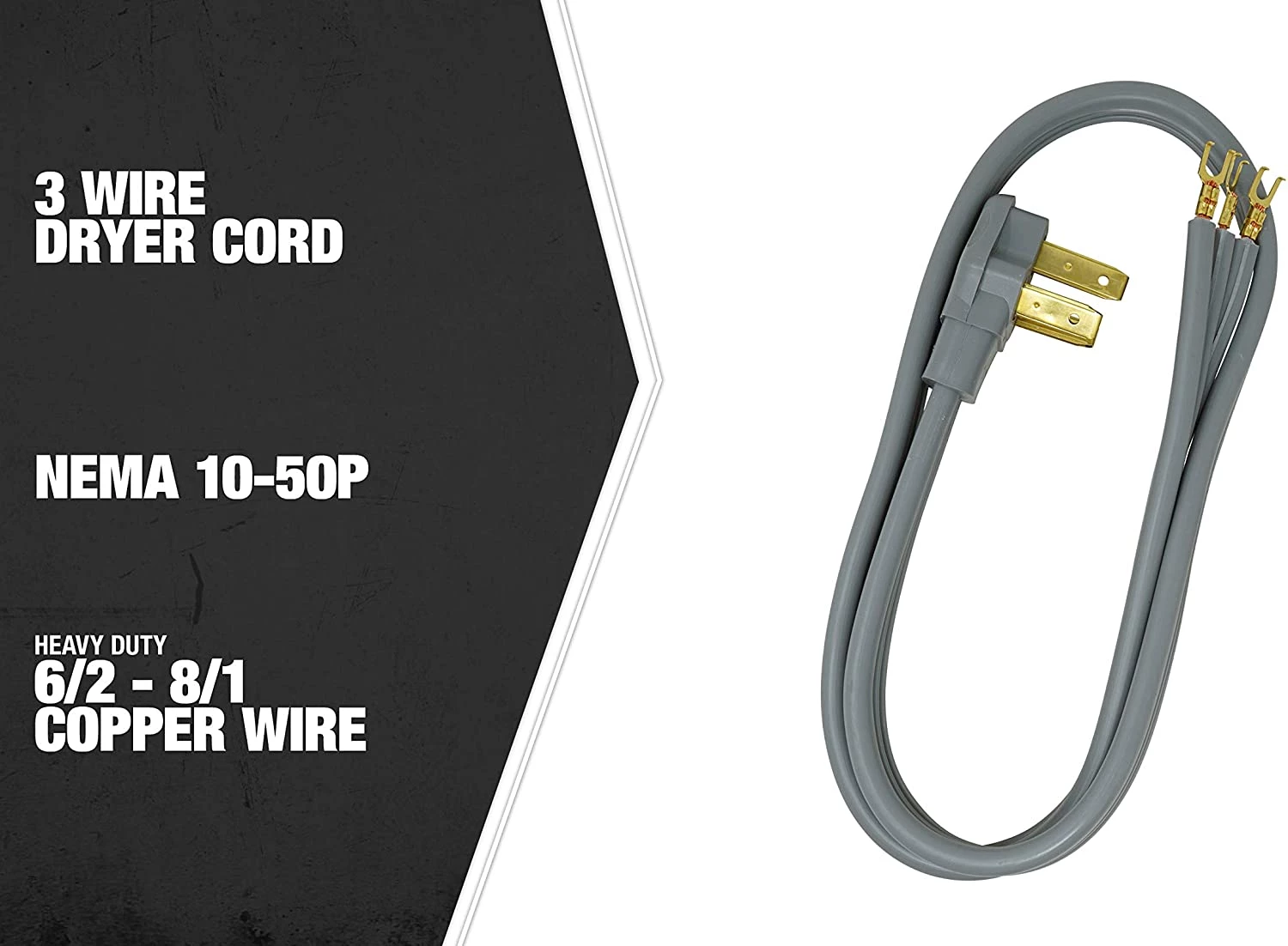 The Southwire Dryer cord is heavy duty 6/2-8/1 copper wire and rated to support up to 125/250V 7500/15000W. All 3-prong range cords have HEAVY DUTY jackets and molded connectors. DURABLE reinforced blades help to prevent accidental bending or breaking of the prongs.