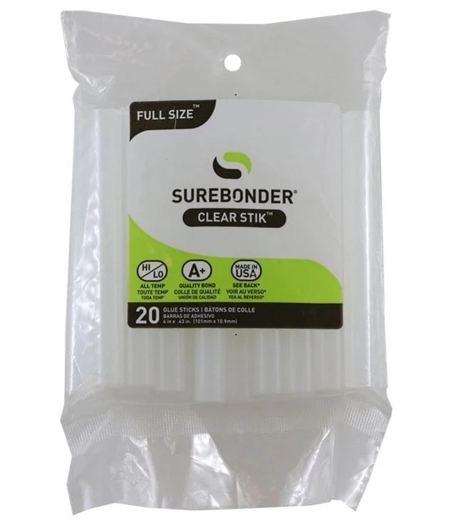 Surebonder All Temperature Glue Sticks is an all-temperature hot melt adhesive that works at either low temperature (230 degrees F) or high temperature (380 degrees F). For use in everyday gluing projects. Use with high or low temperature glue guns. Bonds to metal, wood, paper, fabric, magnets, ceramics, floral arrangements, glass, and plastic using a high temperature glue gun. Bonds to delicate materials such as balloons, ribbon, lace, and children’s crafts using a low temperature glue gun. Clear color with 60-65 second working time.