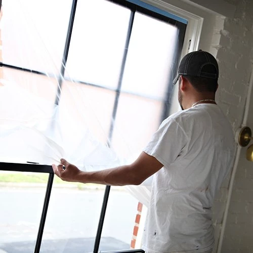 Tape is applied along one edge of high-density masking film. This film has a unique coating which helps create cling to the surface protected – even in windy conditions or with spray applicators.