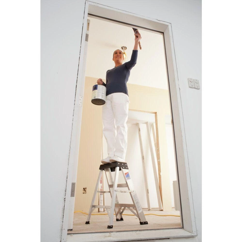 The 150B Aluminum 2ft Step Stool has a large molded top that provides a large standing platform and a duty rating of 300lb. The TRACTION-TRED® steps are slip resistant and the external spreaders are pinch proof. Bottom step has double channel braces and the molded vinyl foot pads are riveted to the rails. The 150B is ideal for construction, plant, office or home applications.