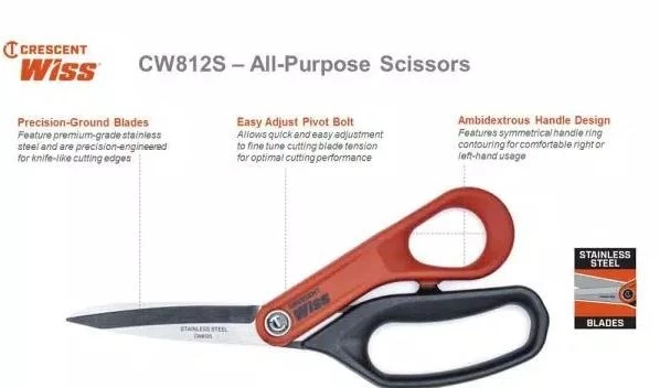 The Crescent Wiss 8-1/2 in. Home and Craft Scissor is great for around the home craft use. The scissors feature soft comfort grips with an oversized, high-leverage bottom ring for easy use. The serrated lower blade grips materials securely to keep cuts even.