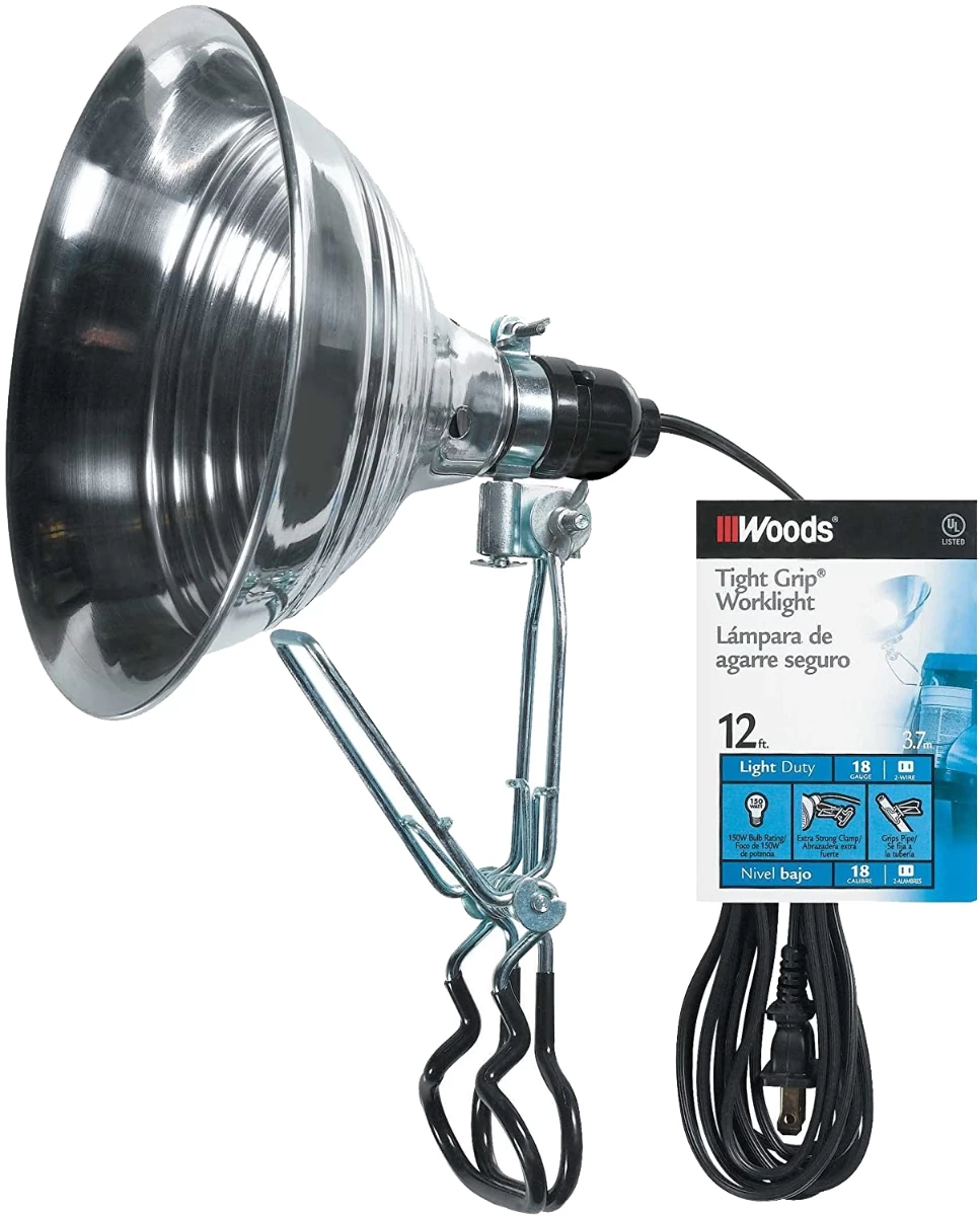 Woods 2839 18/2-Gauge Tight Grip Clamp Lamp with Reflector, Black, 12-Foot. 8.5-inch reflector. On off push through switch and rugged molded-on plug. Provides extra light in workshops, basement, or garage. Push-through switches and strong double-swivel clamps with vinyl grips. Versatile multi-use utility lamps with polished and vented aluminum reflectors. Each unit features a double ball universal joint, non-marring grips and a clamp-on bracket. The Woods (R) brand is a registered trademark of Coleman Cable Inc.