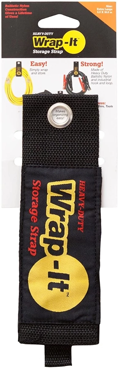 Wrap-It Heavy Duty Storage Straps are the easy and professional storage solution. Simply wrap and store extension cords, rope, jumper cables, cords on power tools and appliances, ski rope, cords and hoses on garage vacuums, Christmas lights, garland, hanging ladders, bikes and so much more. Use them around the house, garage, storage shed or in your car, boat or RV. Size Large holds up to 100lbs